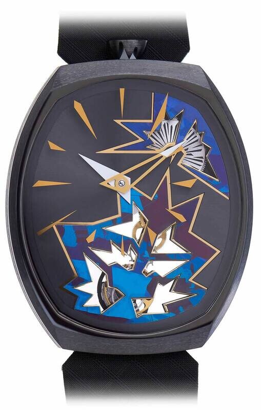 Skeleton watch, limited edition 18 pieces, hand-made in Switzerland. Multi-layered dial with polished gold base plate, black sun-brushed top layer and iridescent purple coloured silicium explosion. Exclusive Fiona Krüger exploding movement, Swiss made, manual-wind with 50 hour power reserve. Slim titanium case with brushed and polished finishing and black DLC coating. Interchangeable strap.