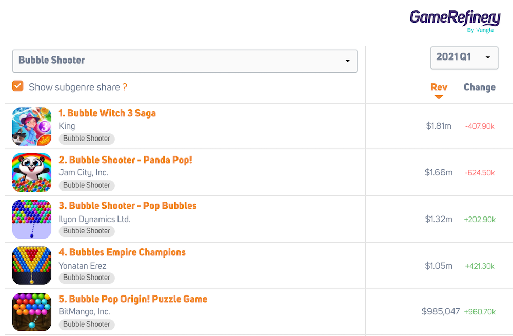 When comparing these subgenres to the overall revenue and the most popular subgenres in these markets, the market shares are not grand. For comparison, in Q1 2021, the biggest subgenre shares were the following: