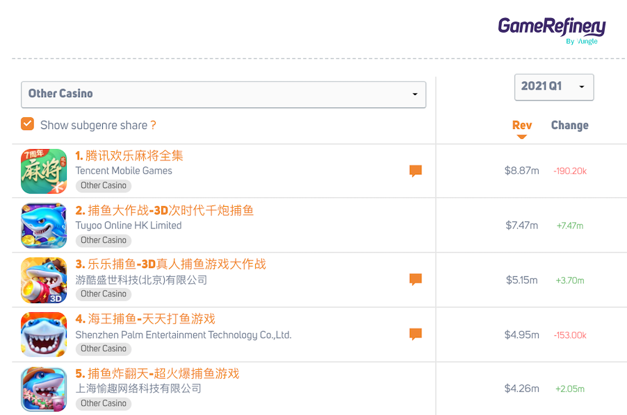 One of the most significant market shares from these subgenres comes from the Other Casino in the Chinese market. These include games such as the so-called “fish-shooting games” or Chinese mahjong games.