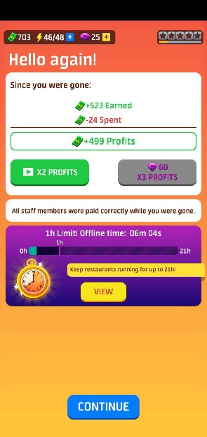 Every time the app is relaunched, players are offered to double the profit that was generated while the app was closed. For an exchange of watching an ad, double the profit or there is an option to triple the profit for gem.