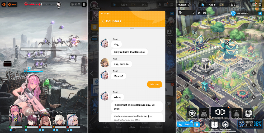 The narrative is a vital part of the drive toward in-game progression. The sci-fi story takes place on a post-apocalyptic Earth where alien robots are trying to destroy mankind, forcing it to flee into underground colonies. The player is sent to explore the surface as the ‘Commander’ of a squad of female defense androids known as NIKKEs.