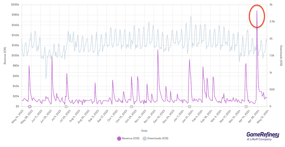 League of Legends: Wild Rift launched two initiatives to promote a new skin collection, Calligraphia. This included the game’s first-ever Top Up event, Spenders’ Splendorous Gifts, as well as the Legacy of the East limited-time gacha. During the launch of these events on 28 April, the game saw a colossal spike in daily revenue in the US of more than 1800%, propelling it into grossing rank 28 and marking the biggest ever increase in its history. You can read more about the mechanics of these events in our Live Events Tracker.